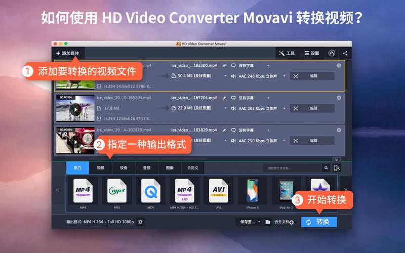 HD Video Converter Movavi 是一款简单易用的多功能媒体文件转换器,非常适合 Mac 环境。 您不仅可以通过该程序转换视频和音频,甚至还能在多种格式之间转换图像文件。