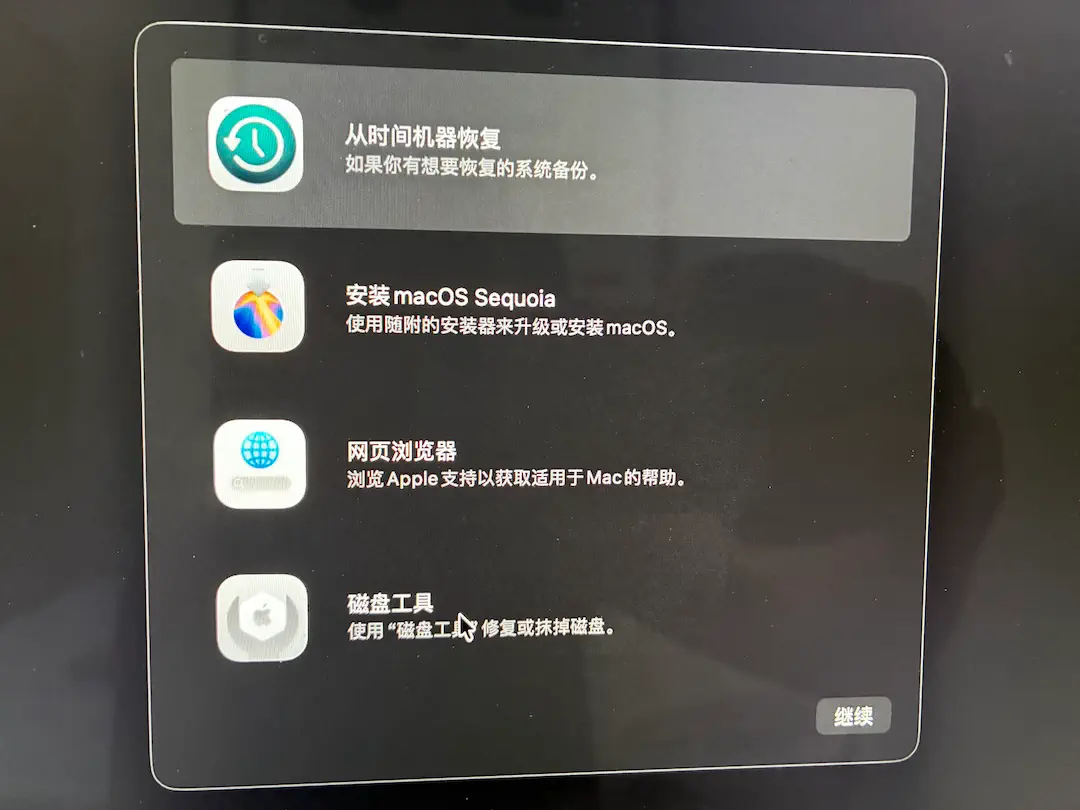 抹掉以后,此时你的 Mac 就空了(所以再进行这一步之前你一定要把数据备份做好),然后就可以继续下一步:重装系统: 选择“安装 macOS Sequoia”。