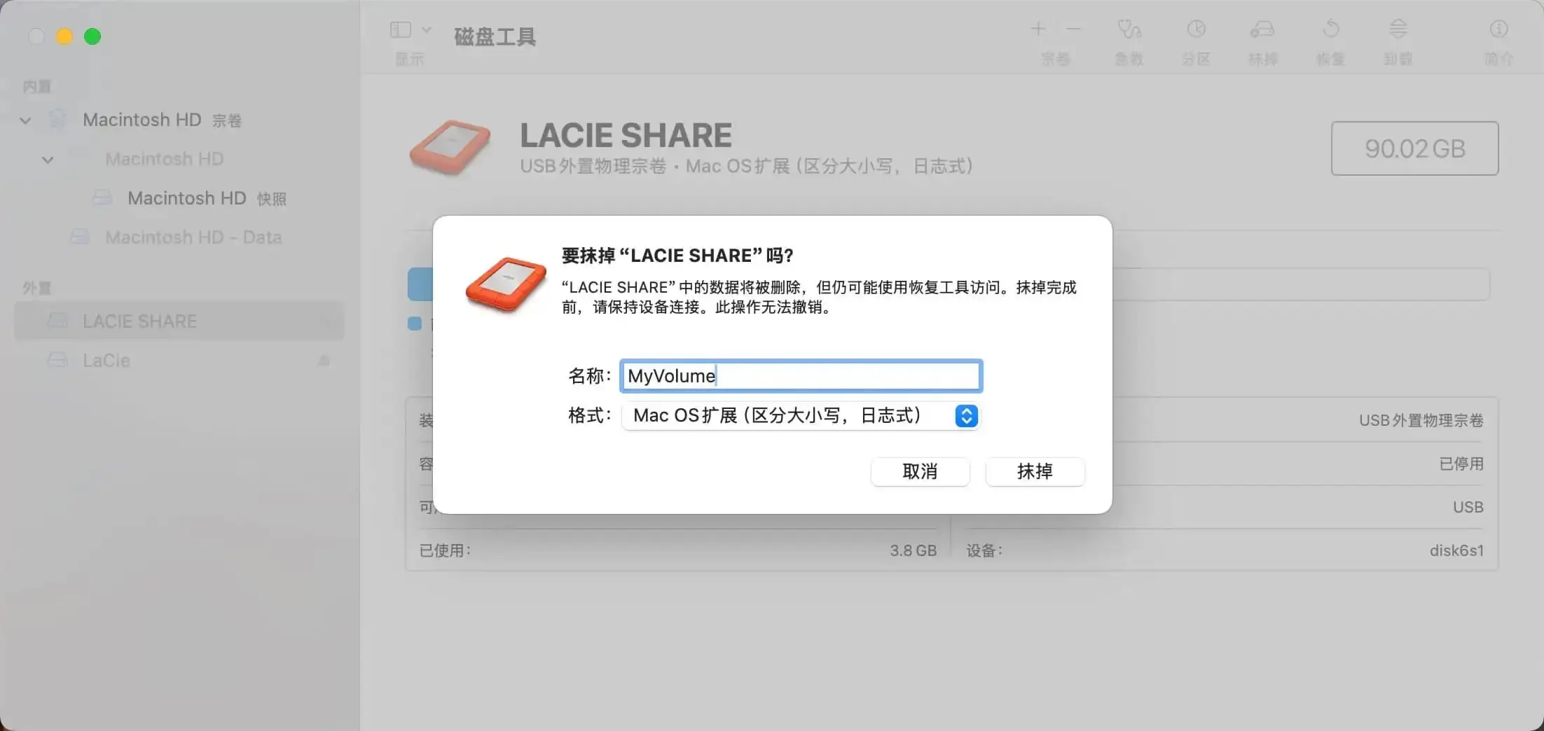 准备一个 16GB 以上 U 盘,插入 Mac,打开磁盘工具,找到它,点击右上角的「抹掉」,此时弹出提示框,命名为 MyVolume,格式选择 macOS 扩展: