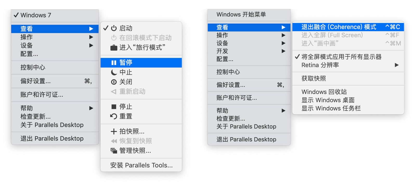 pd 提供了拍快照功能,你可以从快照中恢复系统,pd 提供了融合、全屏、画中画三种浏览模式,我常用的就是融合模式,毕竟用 pd 跑 win 不是为了这个系统,而是为了网银、word/office 办公,只要在融合模式下打开特定软件就够了,不用完全进入 win 虚拟机。外出时打开旅行模式还可以节省更多电量。