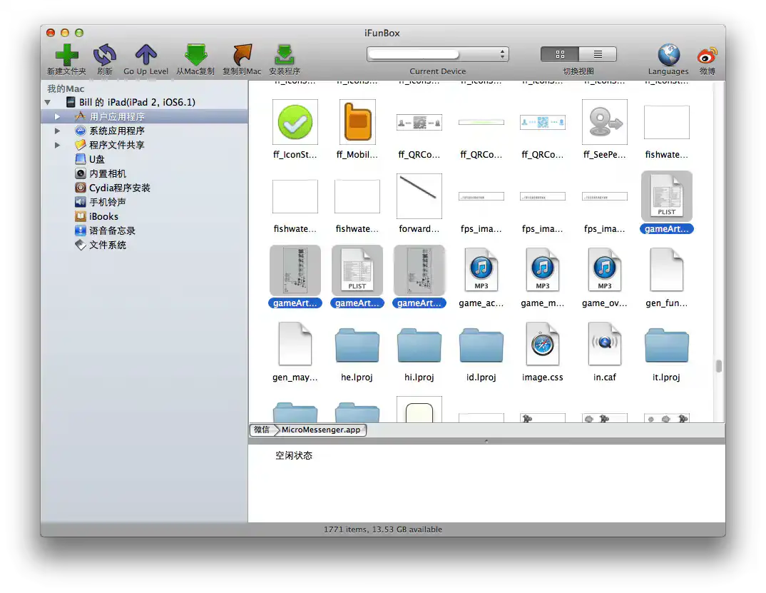 第一步,用文件管理器(例如iFunbox)从你的i设备用户应用程序中找到微信,并在MicroMessenger.app文件夹中找到飞机大战资源文件(gameArts(-hd).plist和同名png文件,拷贝到电脑,-hd表示高清资源,iPhone4和iPhone5用的)。