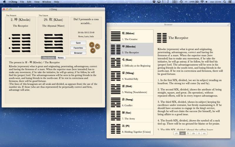 The process of consulting it in this way involves determining the hexagram by a method of random generation and then reading the text associated with that hexagram. The I Ching in itself and the program are localized in English, Italian, French, German and Spanish so that (almost) everyone can easily access the Oracle.