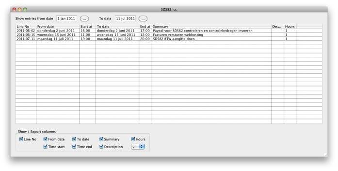 ICSviewer is a tool to convert an exported calender (.ics file) into a table-formatted data grid, while calculating the hours you worked. I made it because I use iCal / BusyCal for keeping track of worked hours, but these apps do not calculate those hours for you.