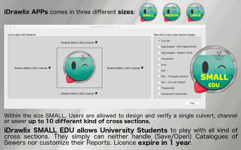 iDrawlix SMALL EDU allows Users to play with all kind of cross sections. They simply can neither handle (Save/Open) Catalogues of Sewers nor customize their Reports. Licence expire in 1 year.