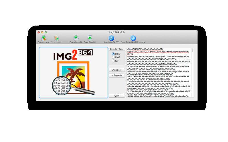 Berlin developed Img2B64 to let programmers easily convert images to Base64 encoding, and, in reverse, convert Base64 code to an image. Base64 basically creates a text equivalent of an image so it can be stored in a database or easily transferred. It also makes sure the image stays intact when moved or stored. Base64 is commonly used in many of the applications you use every day, such as email via MIME, and it also aids in storing complex data in XML. A big advantage of Img2B64 is that you can export your Base64 image to CSS and HTML, which speeds up the loading time of your web page on current desktop and mobile browsers. Exporting your image to CSS as Base64-encoded strings circumvents additional HTTP requests, which also helps you speed up your mobile HTML5 applications. Because Img2B64 uses standard OS X image libraries, you can also perform other image conversions, such as PSD-to-PNG, and then those images to Base64 strings and back again.
