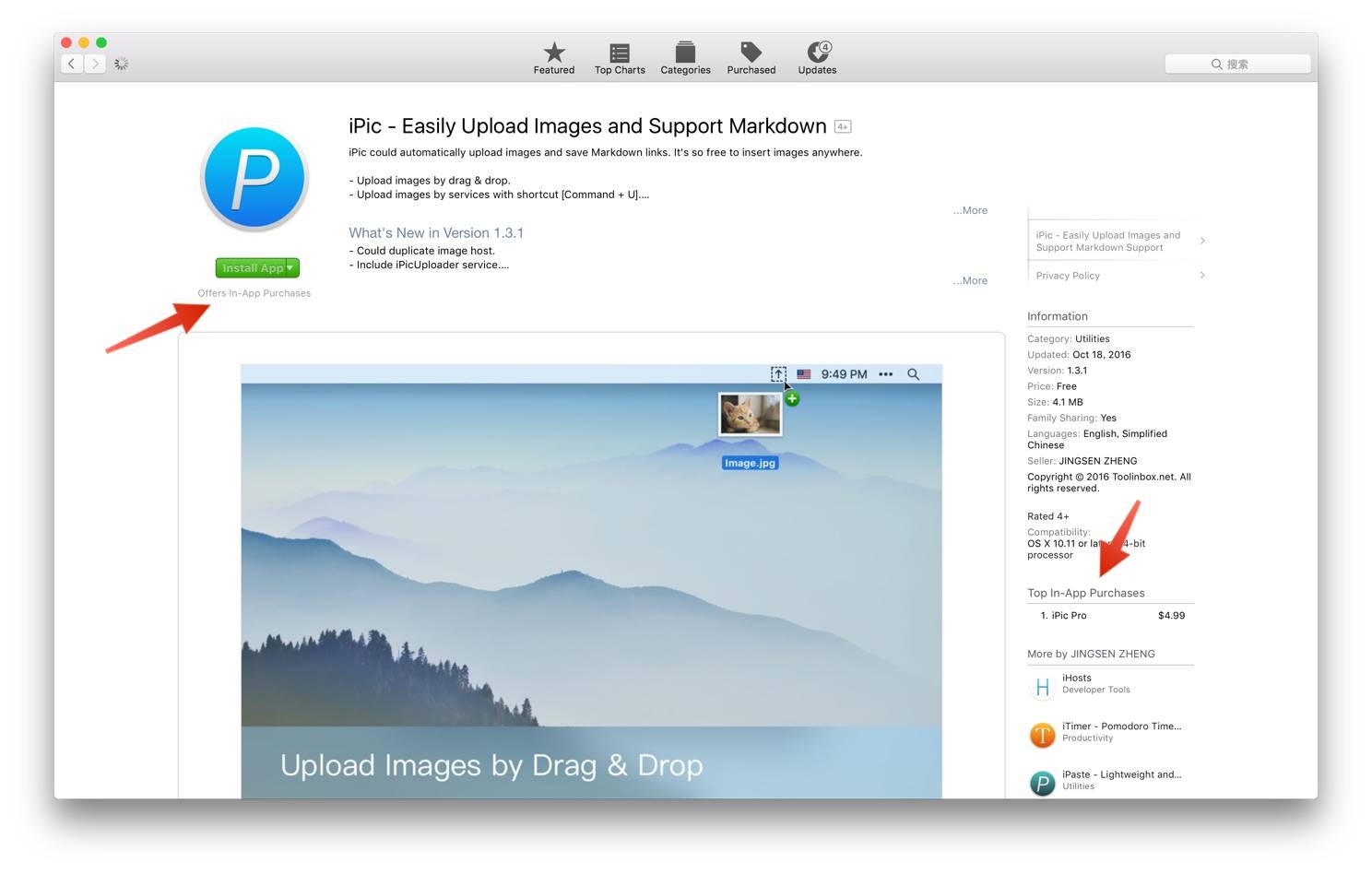 以 MAS 举例,我们在 MAS 内如果看到软件下载按钮下方标有「App 内购买项目」的文字,说明软件内提供了内购服务或进阶功能,在软件单页右边栏简介下方还可以看到内购项目的名称和价格。