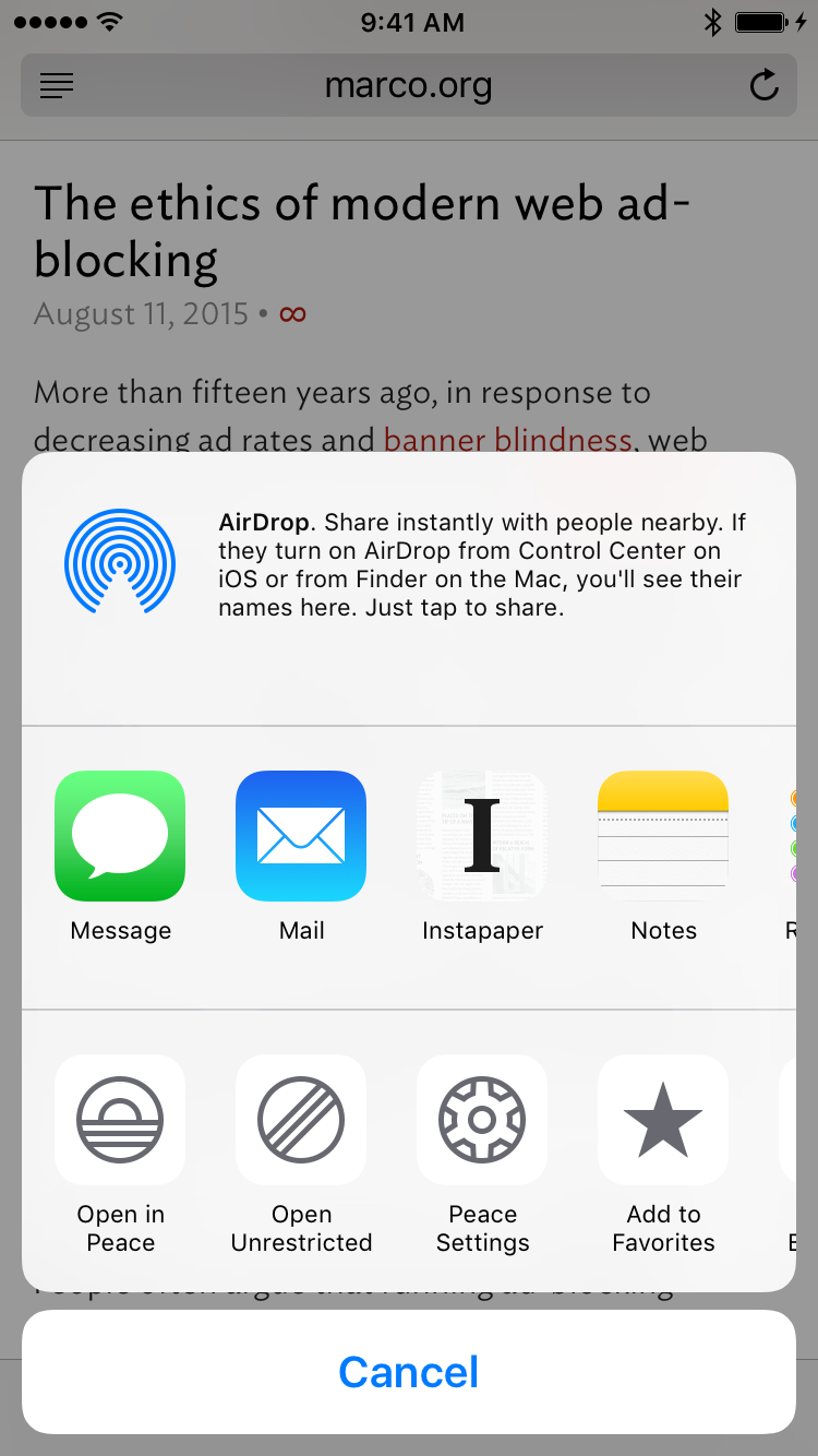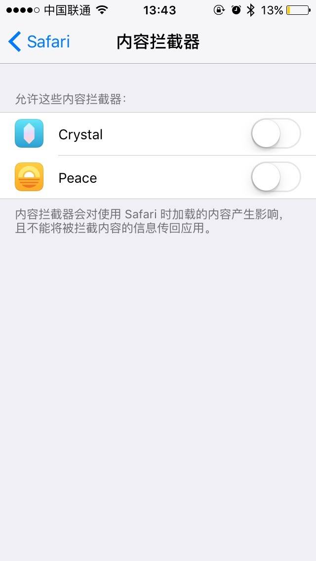Content Blocker 应用目前仅能用于 Safari 移动浏览器上,现在排行榜上比较流行的是 Peace、Crystal 以及 Purify 这三款应用,功能都差不多,可以自动帮用户把网页里的广告、追踪代码、恶意脚本、社交按钮,字体屏蔽掉,甚至是评论框都难逃她们的魔掌,从而加速网页打开速度并给用户一个安全的入网环境,如果你想访问带广告的原页面,也可以从 Extension 菜单里打开诸如 “Open Unrestricted” 这样的按钮。据开发者称他们的应用不会追踪用户上网记录,目前也仅限于 64 位 iOS 设备,也就是说 iPhone 5 及以下 32 位设备并不能使用这类应用,同理,iPad 也是。
