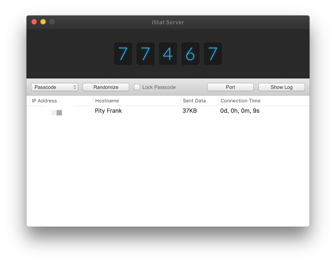 Mac 端的 iStat Server 提供了 6 位 PassCode 和 Password 两种连接认证方式。或者只要你能知道对方设备的公网 IP 地址以及端口号(默认 5109)也能与其取得连接。