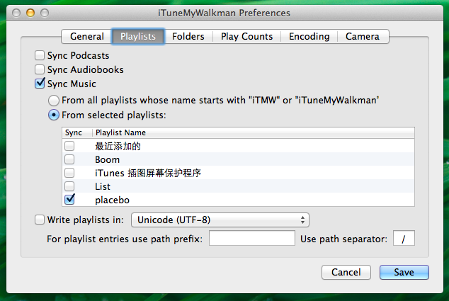 使用Android及其他电子便携“玩具”的同学们一定不要错过“iTuneMyWalkman”这款Mac软件,它能自动将指定的iTunes歌单及曲目同步进“玩具”们的指定目录,在主窗口第一栏选择“Edit Preference“,进入设置,在”General“里可为”玩具“设置存储歌曲的文件夹,也可以勾选”When the phone is detected,Synchronize automatically”,这样手机插上Mac时会自动同步歌单。