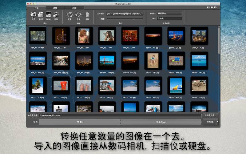 各种格式之间进行转换:Photo Converter 是革命性的方式来处理您的图像。转换您数字相机原始数据文件中所有的流行的图像格式,如 JPG、 PSD、 RAW、 TIFF、 TGA、 BMP、 GIF、 JPEG 2000 和更多。