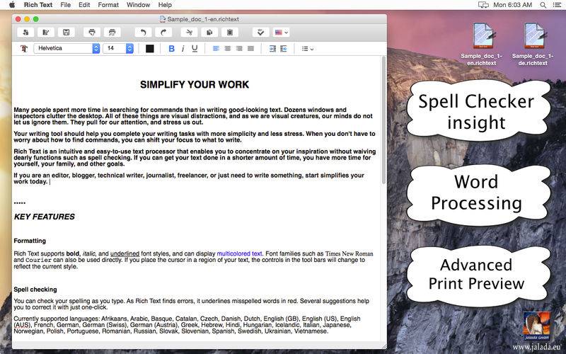 Rich Text is an intuitive and easy-to-use text processor that enables you to concentrate on your inspiration without waiving dearly functions such as spell checking. If you can get your text done in a shorter amount of time, you have more time for yourself, your family, and other goals.
