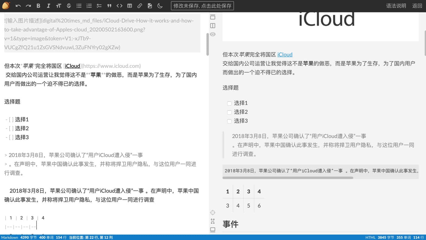 市面上的 markdown 一直是开发者获利的绝佳市场,但也是竞争最为激烈的领域,但是大部分用户,我相信这个比例在 90% 以上的用户是用不到 md 软件自创的那些需要订阅付费使用的增值功能,大家的需求很简单,就是要编写出高质量的 md 文稿,这就足够了,坚果云markdown 提供的 md语法足够丰富,基础的有,进阶的代码、表格、注脚、公式编辑器也有,而且提供了分页预览模式,对于新手足够友好。