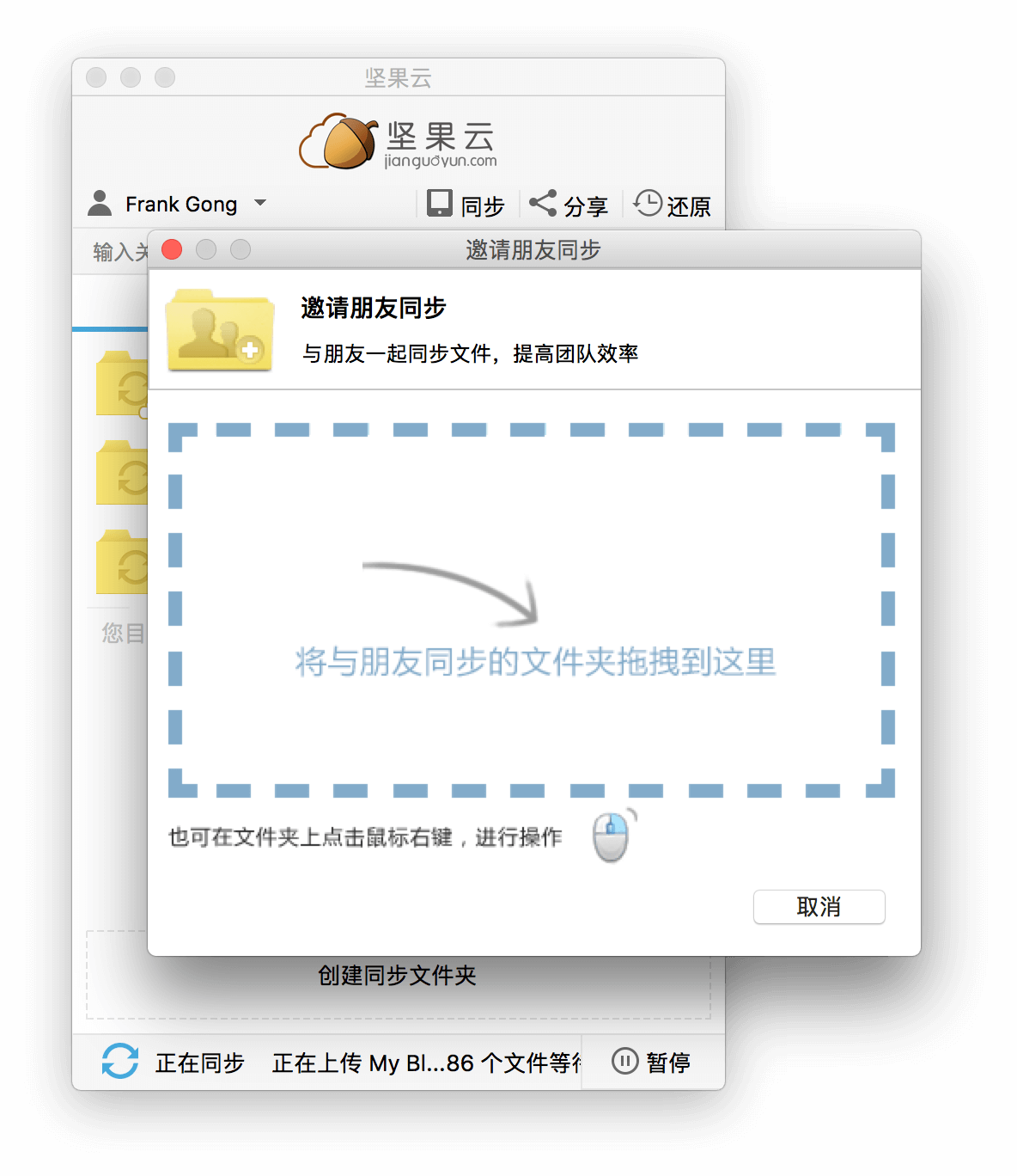 创建欲与朋友同事协同控制的文件夹很简单,只需在本地目录上右键选择「坚果云 – 邀请朋友同步」即可,或是采用文件夹拖拽的方式: