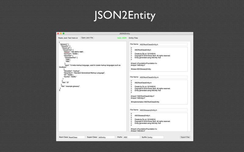 自动将JSON转换为Model类的工具,目前只支持导出为Objective-C语言。 使用JSON2Entity,您可以: - 递归生成JSON包含的所有对象 - 自动检测JSON数组元素并映射生成相应类 - 预览生成的OC文件 - 自定义类名的前后缀 - 自定义Model的Super Class - 进行JSON合法性检测