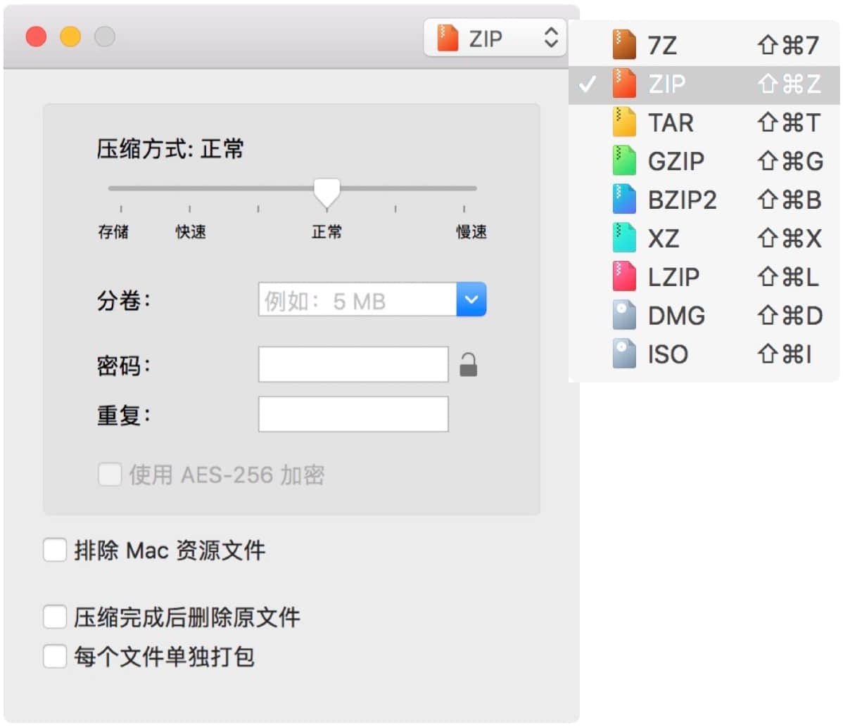 新版的界面也做的更加清爽了,可以选择压缩方式以及分卷的容量,设置密码,还能选择 AES-256 的加密方式。