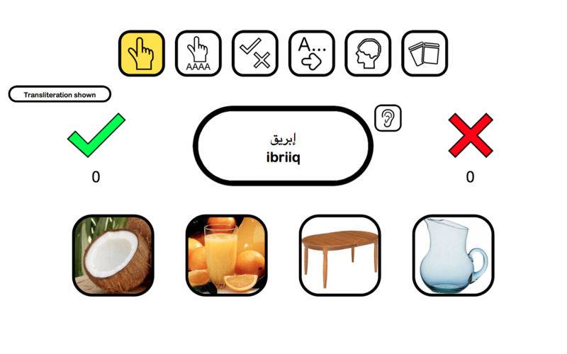 Vocabulary trainer: choose the corresponding image to the Arabic word given.