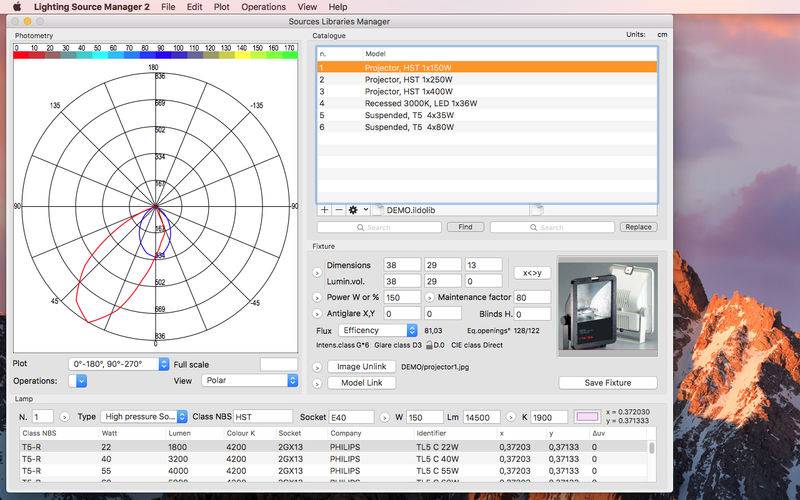It is possible to view, scale, rotate, mirror, stretch the single photometry or sum two ore more of them and save as a new fixture. Furthermore each photometry can be exported in IES or EULUMDAT format or as PDF or BMP drawing file.