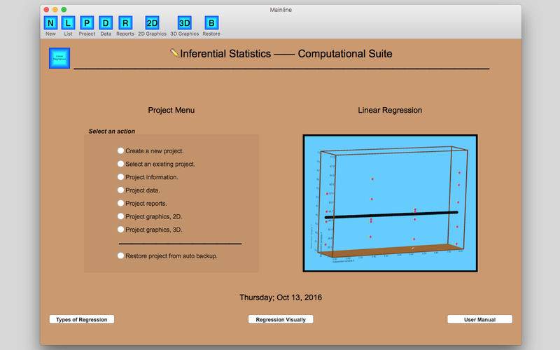 LinearReg will compute a linear equation for a given set of x,y coordinates. A statistical summary is also included, along with graphics (2D and 3D). Any number of projects can be stored in the LinearReg database, and an infinite number of data points are allowed for each project. Transformations can be specified during data entry.
