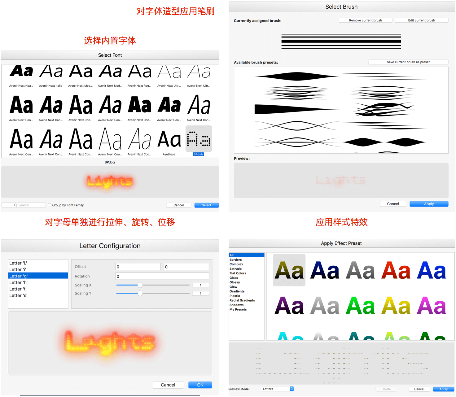 以下是在 Logoist 中设计艺术字体时需要用到的一些功能,比如你可以从字体库中挑选喜欢的字体风格做实验,选择笔刷样式对字体进行再加工,或是对字母进行单独的拉伸、旋转、位移等操作;Style Preset 就更不用说了,上百种样式等着你去甄选。