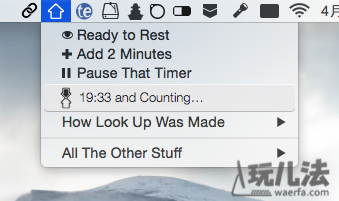 不过软件也仅仅是将法则的第一、三条引入进来,第两条完全靠用户自觉操作,软件是不可能帮我们提醒的。开启 Look Up 后,软件自动进行倒计时,20分钟后系统通过 Notification Center 发送通知询问你是否开启休息模式,进入休息模式后,20秒为一个时长,你可以选择暂停,如果不需要休息,可点击“Back to It!”返回普通状态继续工作。这里留一个讨论点,开发者设计一个“Pause”(暂停)按钮有何用处呢?