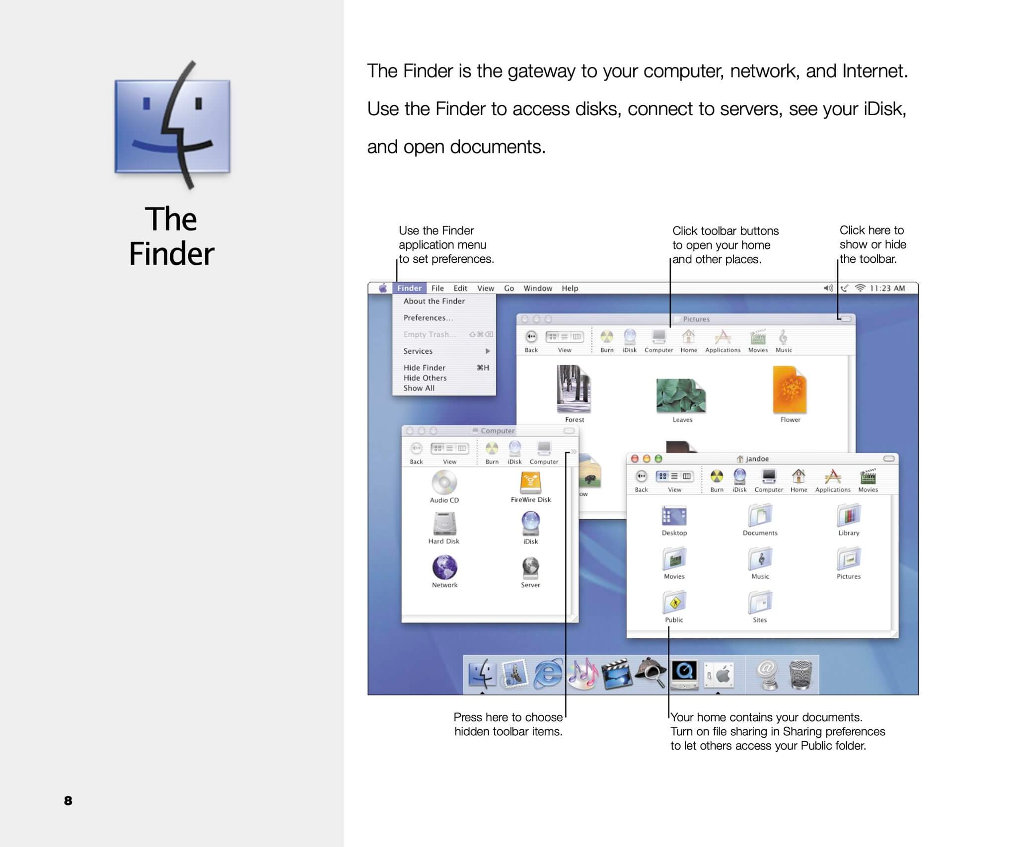Aqua 界面引入了众所周知的 Dock,可以方便地直接从桌面访问应用程序和文档,此外,它还包括苹果改造后的 Finder,用于文件管理。当然,Aqua 最为人所知的是其标志性的外观,包括半透明的滚动条和按钮。
