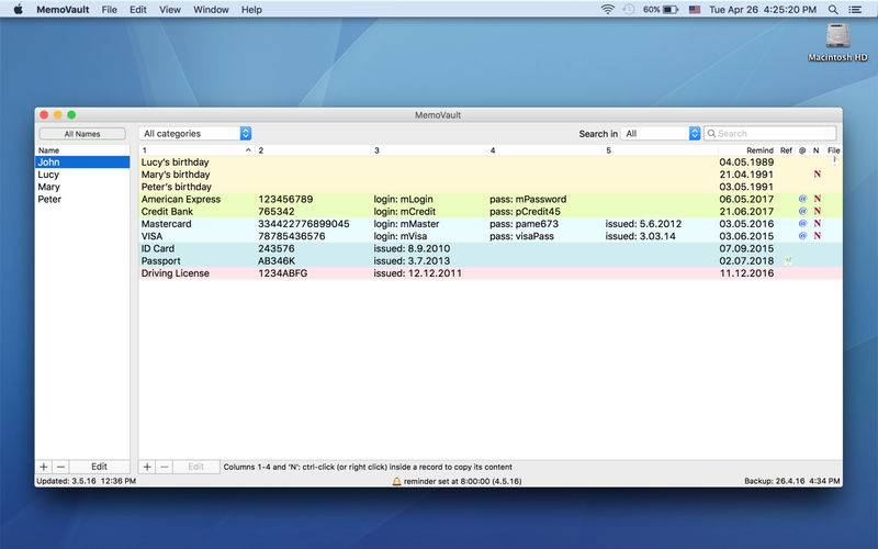 You can view records by their ‘Category’ (i.e. Label), search for words, make the application remind you (even automatically!) of anniversaries and expiration-dates, retrieve a picture or any other file or folder related to a given entry (for instance, copy of your Passport, Driving License, and so on), connect to Internet etc.