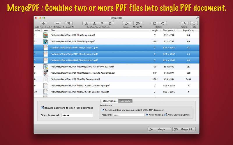 MergePDF is an ultimate tool to merge two or more pdf files into single PDF document. MergePDF can also allows to set metadata and encrypt your merged document. MergePDF do perform merging operations by preserving exact PDF contents (means structure of the file, color profiles, fonts, links, bookmarks) without losing document’s integrity and does it very fast.