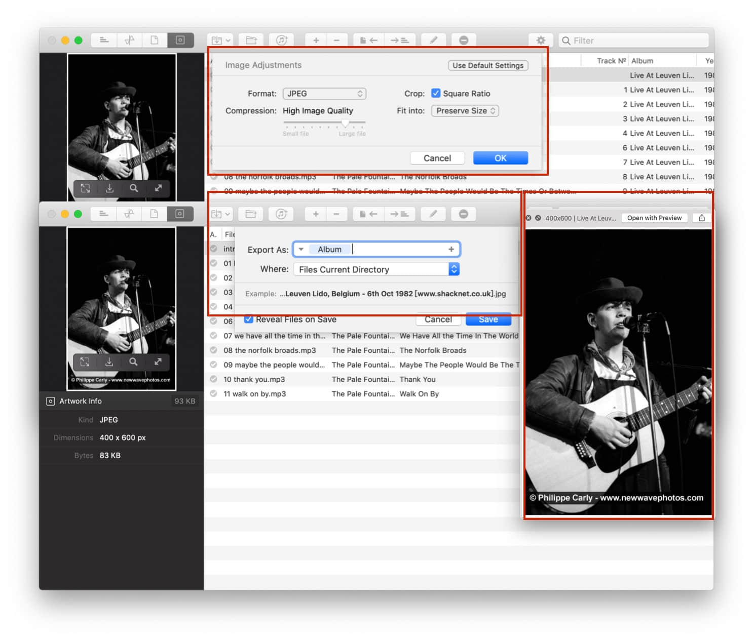 专辑封面的信息编辑是考验一个软件专业度的最好方向,Meta 可以对封面图片进行格式选择,设置压缩比,自动按照比例进行剪切以及尺寸自适应规则。另外还有专辑封面图片导出至本地、预览的功能。