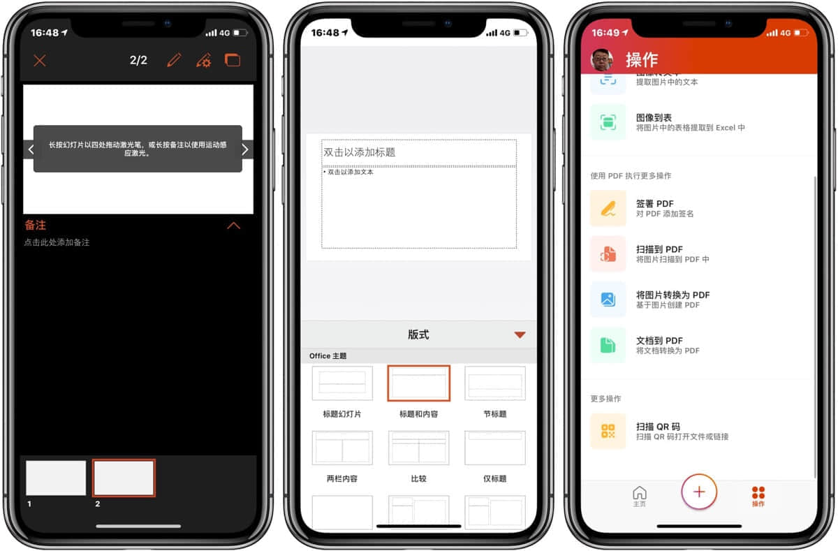 如果你之间经常使用移动版的 Office 三剑客,那么全新的 Microsoft Office 对于你来说没有任何障碍,除了传统操作,在这个超级 app 上还内置了以下几个扩展动作: