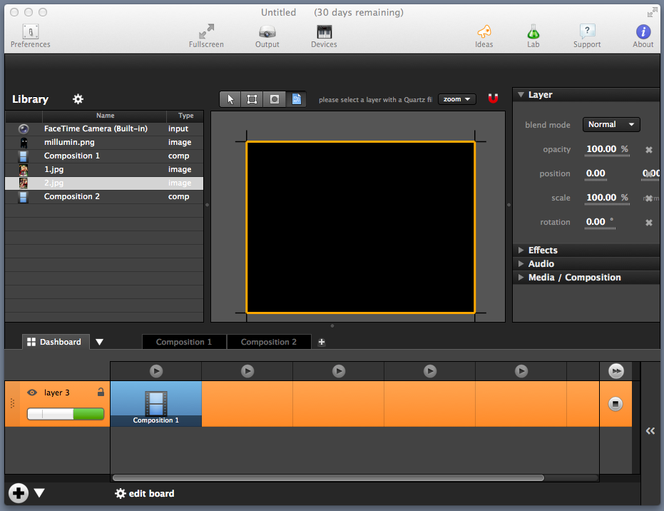 Millumin是一款操作简单的视频剪辑与渲染工具,你不需要像使用Final Cut那样学习太多的专业教程,就能在最短时间内掌握制作技巧;Millumin主界面分四大区域,分别是Library(素材库),Workspace(编辑区),Properties Panel(渲染区),Dashboard(层管理)。