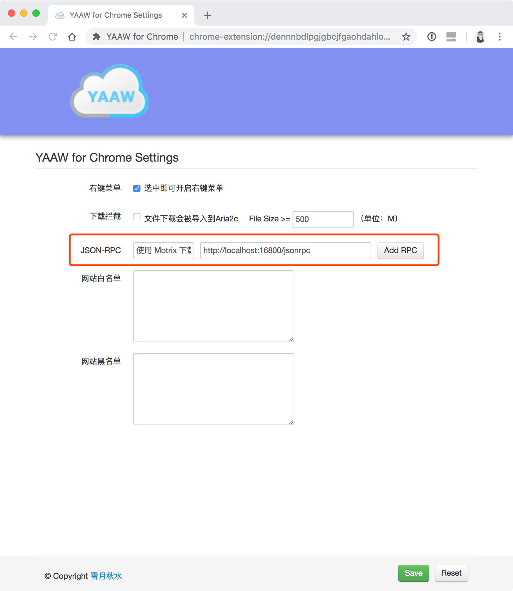 这款软件还可以配合 Chrome 插件 YAAW for Chrome 进行 Chrome 普通任务的拦截 ,安装完成之后修改配置如下: