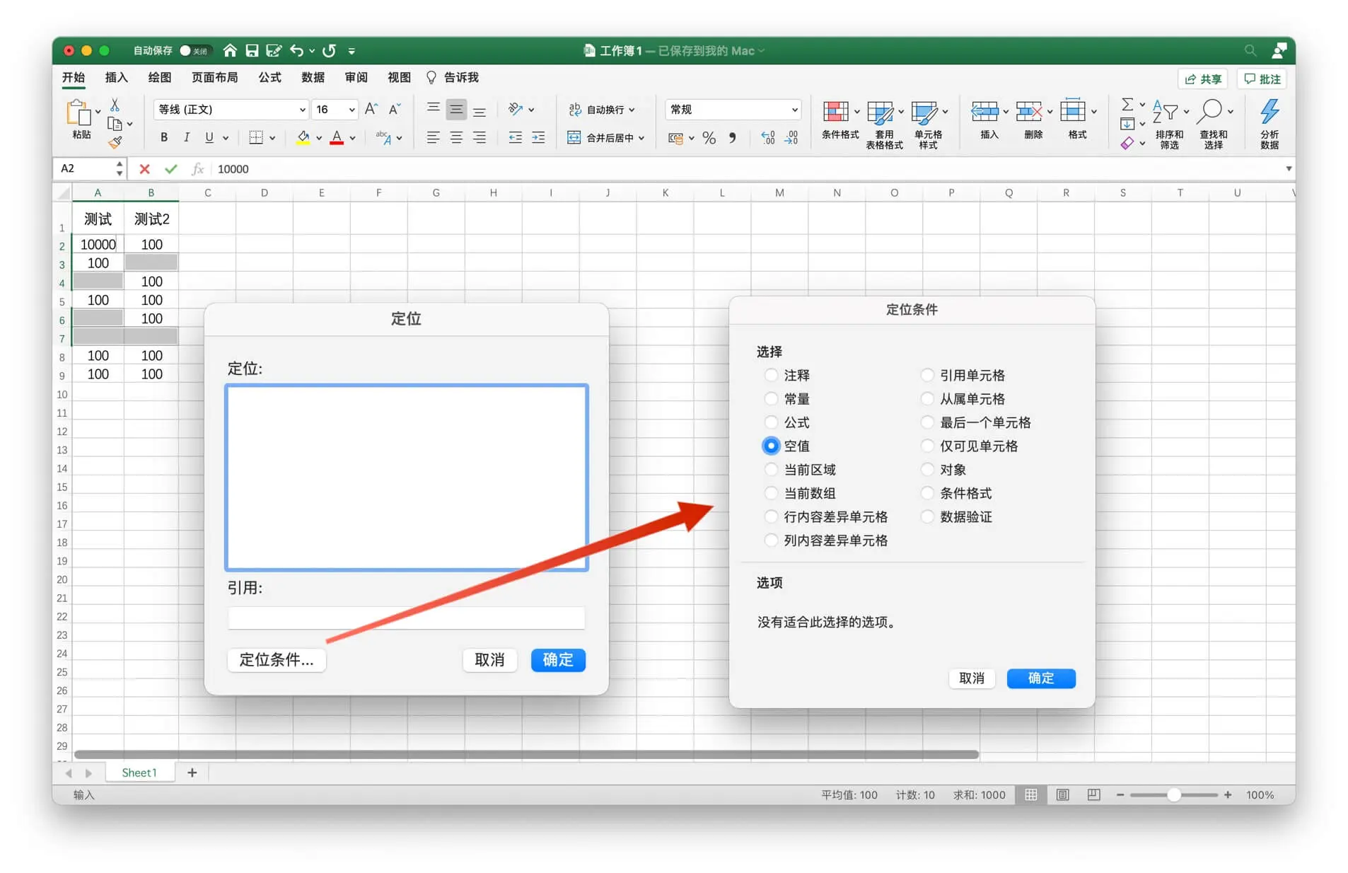 然后通过组合键 CTRL+G 调用定位窗口,在定位条件里选择“空值”,点击确定后所有为空的单元格都被定位出来了,背景色为灰色,然后在第一个被定位出来的单元格输入10000