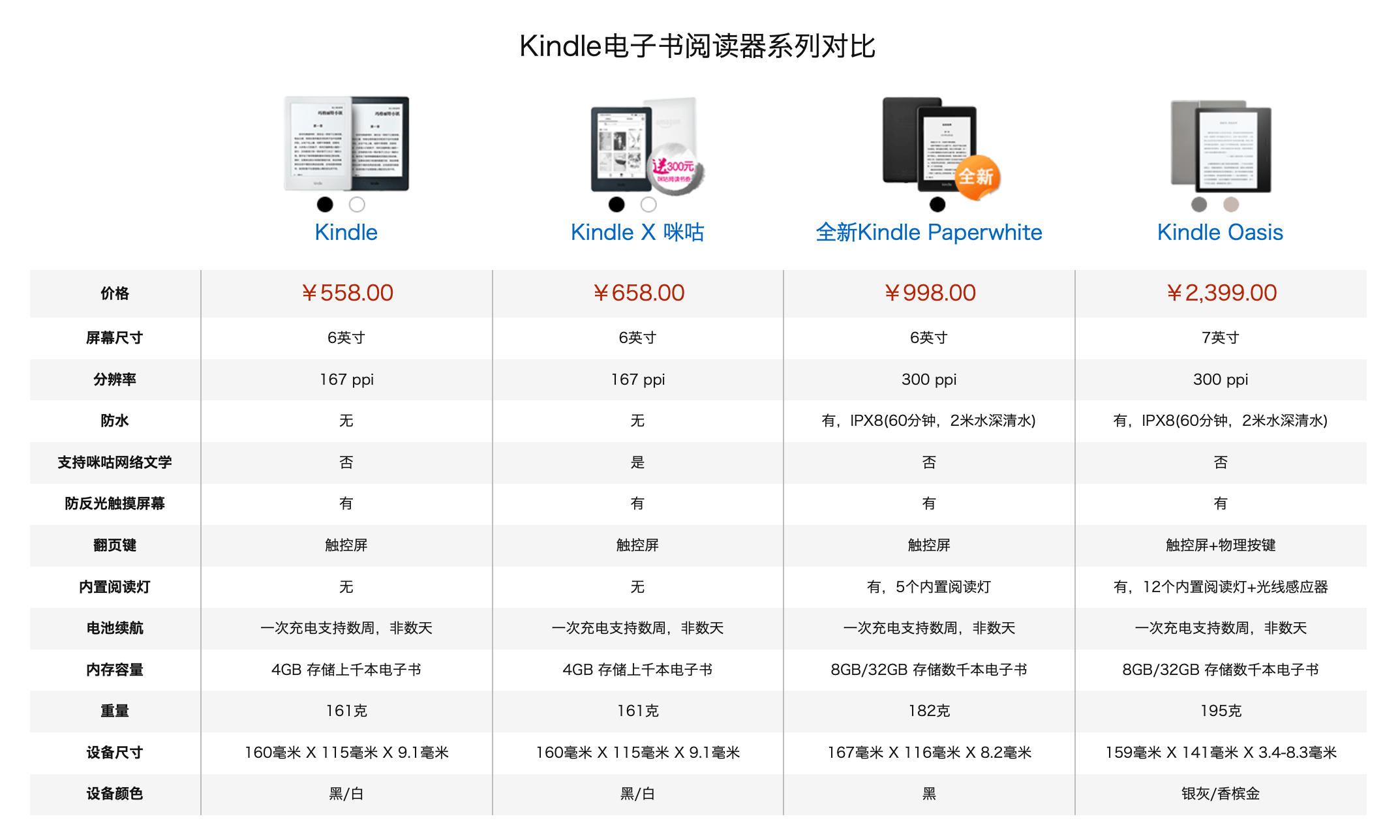 本周,亚马逊在全球同步发表了其最新一代的 Kindle Paperwhite 电子书阅读器,新版拥有一块与 Kindle Oasis 相同的纯平 300ppi 电子墨水屏,有 8GB/32GB 两种内存版本可选,最重要的是新增了防水溅功能,价格小幅上涨,由 958 元增至 998 元(8GB,32GB 为 1258元 )。