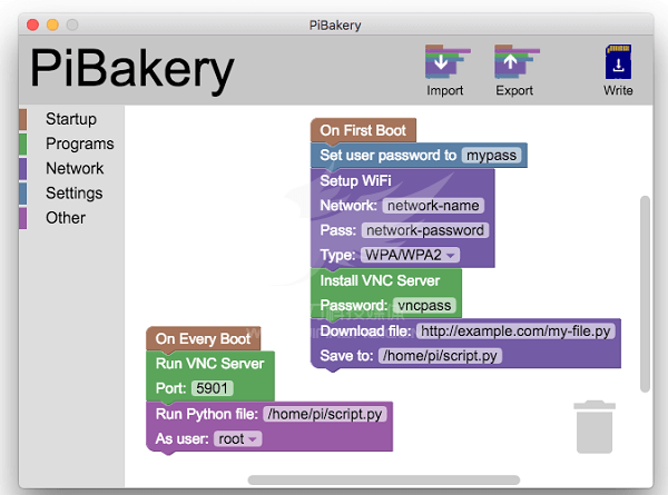 PiBakery 可以预设各种选项,比如 Wi-Fi 密码、应用程序安装包、启动时要运行的程序、甚至完整配置 Apache / VNC 服务器等。PiBaker 可以轻松上手,用户无需任何 Linux 经验,非常适合树莓派初学者们使用。只需在流程图中进行拖拽,即可完成任务安排。