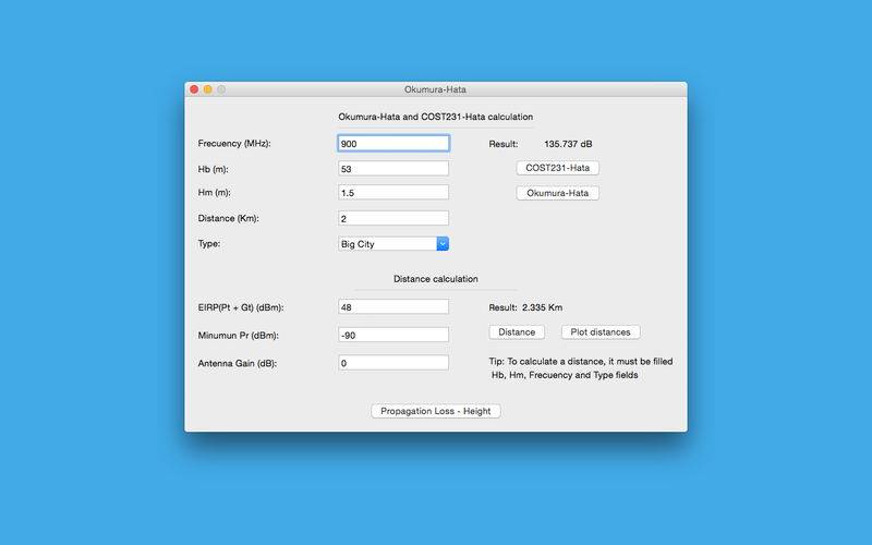 With this application you can obtain Cost231-Hata and Okumura-Hata values, also you can plot the radio coverage and propagation loss.