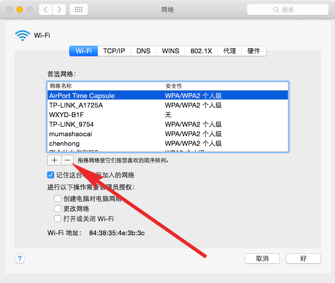 第四步:选择该网络,然后单击减号按钮来删除(忘记)该无线网络。