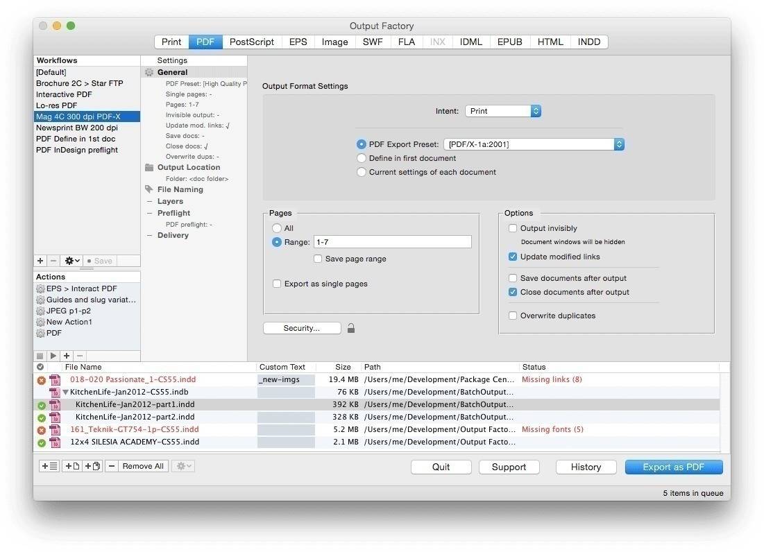 Output Factory automates printing and exporting from Adobe InDesign. Batch print, export as single pages with variable file names, output layer versions, update modified links on the fly, preflight InDesign files before output, output to several formats at once, and much more. Just select the documents, adjust settings, and Output Factory will do the rest for you automatically. Keep working with other programs while Output Factory processes InDesign files in the background. Or let Output Factory work while you're on a lunch break. Or leave it working overnight to output hundreds of documents, and the job will be done when you return in the morning. Features Batch output InDesign files with a click of a button Supports print. PDF, PostScript, EPS, JPEG, TIFF, PNG, GIF, Flash, INX, IDML, EPUB and HTML Export as single pages Output files to multiple formats at once Layer versioning: output layer combinations as single files Variable output file names Preflight InDesign files before output Update modified links automatically Process InDesign books (.indb) Preflight final PDF with Acrobat Pro droplets Send output files automatically over Internet and locally Note: Output Factory is the new major version of BatchOutput. BatchOutput users can upgrade to Output Factory at a discount.