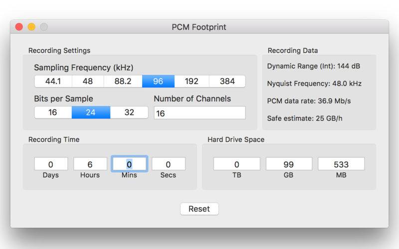 These calculations only take pure PCM data into account (e.g. lossless WAV or AIFF, excluding headers). For more information about the footprint of file type or codec specific data, please refer to the specifications of the file format and/or codec you are using. Data sizes may vary heavily from the results indicated by PCM Footprint when using compressed formats or anything else that is not linear PCM audio data storage.