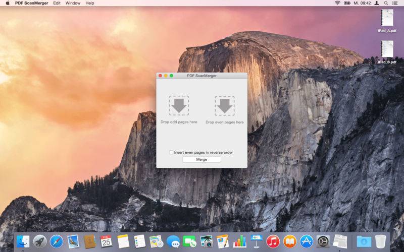 PDF ScanMerger allows you to merge the even and odd pages of your document the simplest way possible. Scan your document pile first on one, then on the other side and drag the two created PDF files onto the placeholders of the app. Just click "Merge" and you can save your completed PDF file.