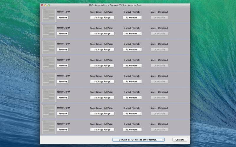 PDFtoKeynoteFast can convert PDF to Keynote quickly and preserves the original text, images, layouts, hyperlinks, tables, and graphics with high accuracy. After conversion, you can easily edit or reuse the PDF content in other application.