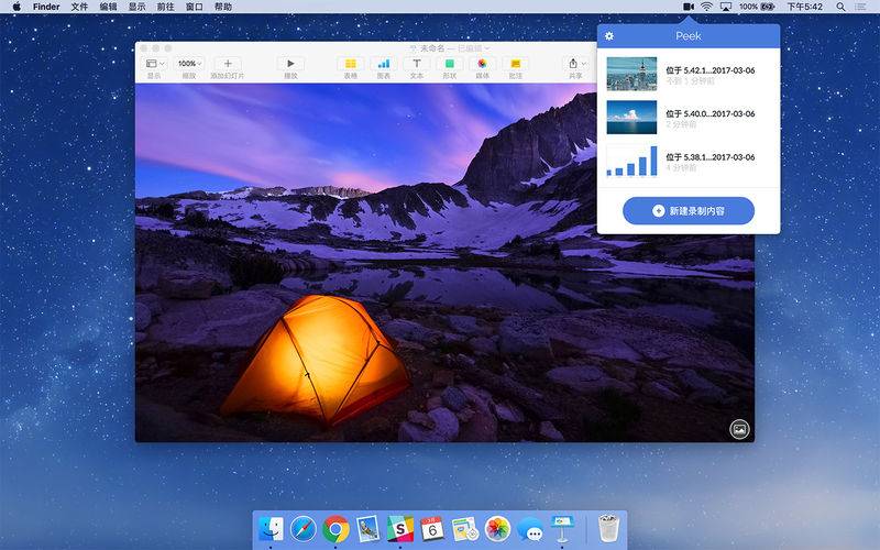 使用 Peek(一款截屏视频应用程序,属于 Articulate 360 的一部分)在您的 Mac 上轻松录制截屏视频。在您需要时,Peek 始终位于您的 Mac 菜单栏上。选择您想要录制的应用程序,然后拖动框架以自定义您的视图。您可以从简单易用的下拉菜单中选择您的麦克风,然后检查音量大小,以查看您的语音是否响亮、清晰。只需单击即可将 Peek 截屏轻松上传至 Articulate 360,或通过唯一链接将其共享到任意位置。通过 Peek,您可以非常轻松地在您的 Mac 上创建快速截屏。