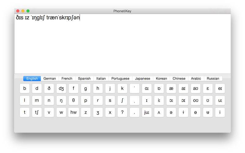 PhonetiKey allows you to easily type IPA (International Phonetic Alphabet) symbols for the English, German, French, Spanish, Italian, Portuguese, Japanese, Korean, Chinese, Arabic and Russian languages.