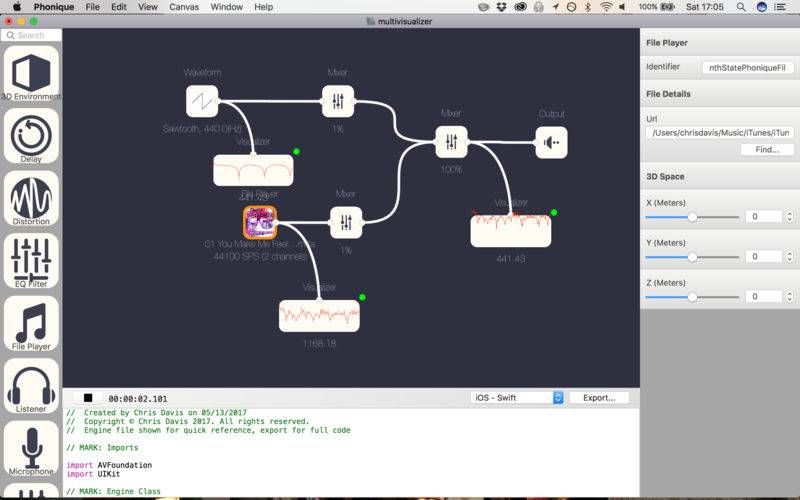 Drag, Drop & Connect to create Audio Engine Graphs and export the results to Swift 3.