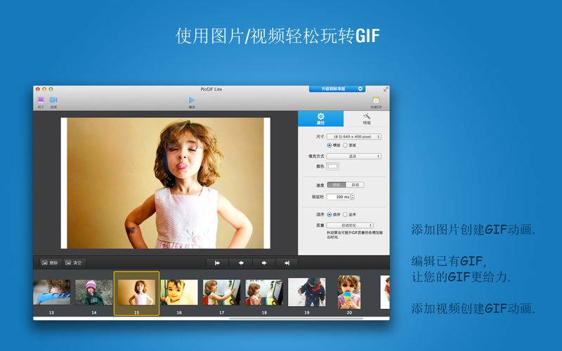 PicGIF的功能非常强大,它允许用户在极短的时间内将照片和视频转换成栩栩如生的动态GIF图片. 用户可自定义GIF的大小, 播放顺序, 速度等. 还可以将制作完成的GIF通过电子邮件, 短信, Tumblr与朋友分享或者直接将其保存在电脑上.
