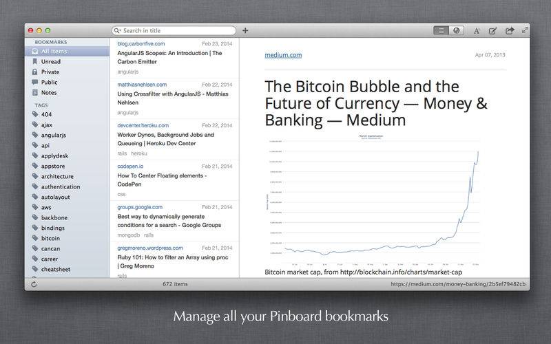 Pins translates Pinboard's no-frills, minimalistic, yet fast experience to your Mac. Get the most out of your bookmarks, with a quick, modern and comprehensive app.