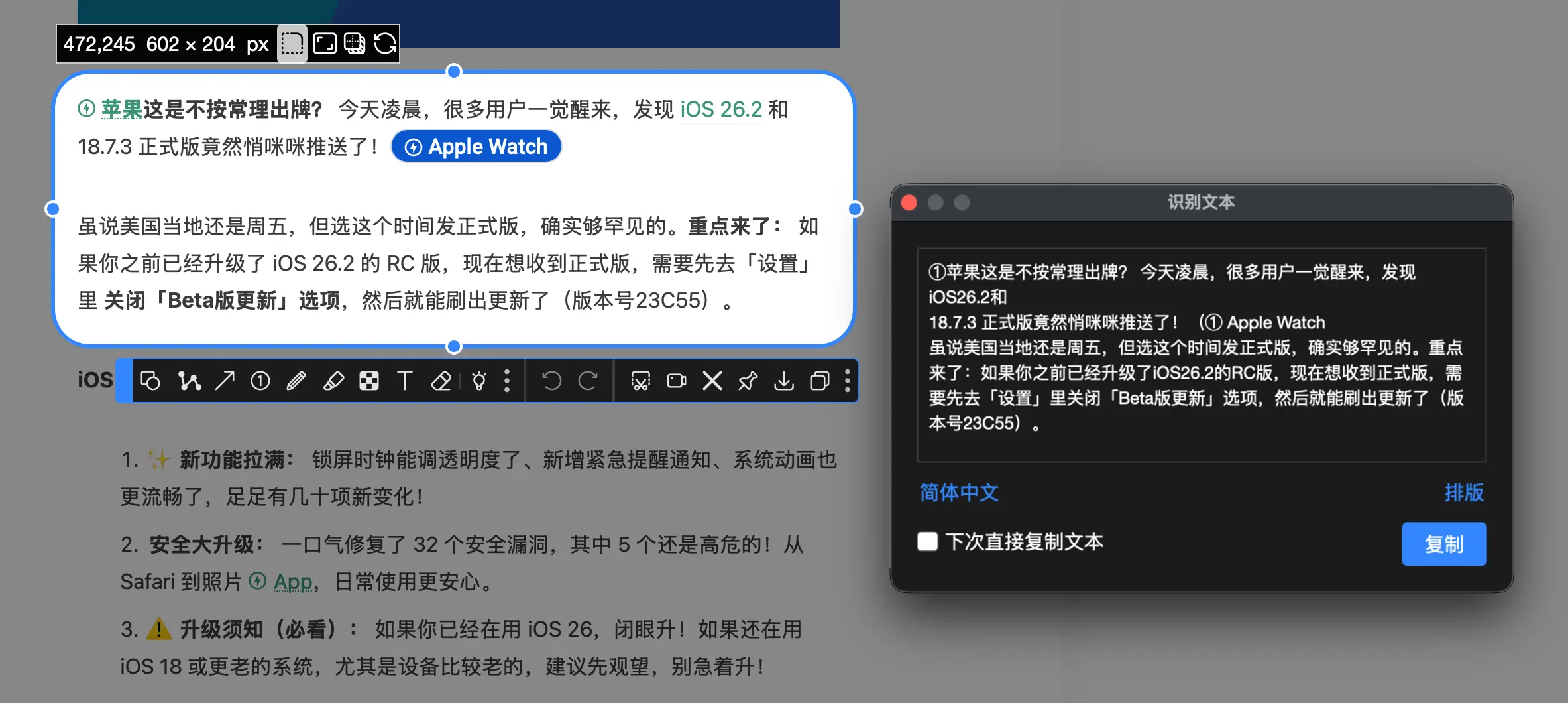 应用场景:提取视频里的字幕、复制报错弹窗里的代码、抓取无法复制的网页内容。