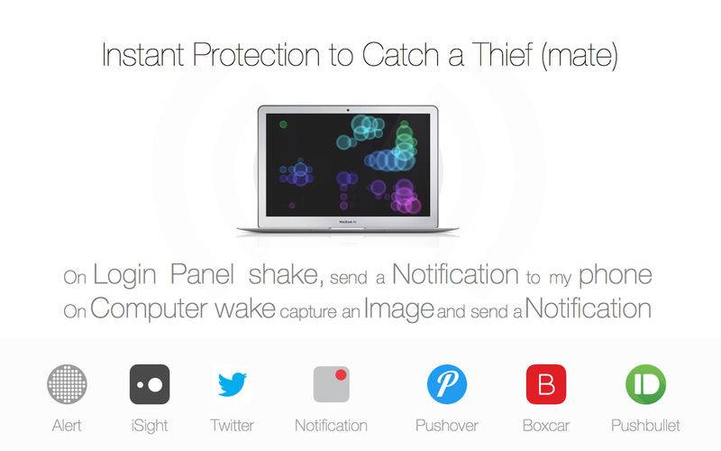 Sensors currently available are observing the MagSafe adapter, computer power-state, connected screens and login window. Any sensor activity can result in an alert sound, iSight snapshot, local notification, a Boxcar, Pushover or Pushbullet message to your phone, or a post on Twitter.
