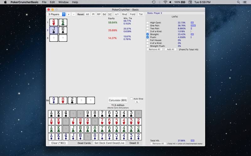 PokerCruncher-Basic supports up to 10 players and specific cards and random/unknown cards. Even though this is the Basic version of PokerCruncher, it has additional features like hand type stats, dead cards, and n:1 odds that some other odds calculators don't have.