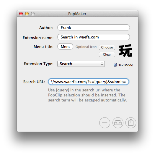 PopMaker生成一个PopClip插件的速度无人能敌,整个插件的信息必须包含“Author”,”Extension Name”,”Extension Menu Title”(可插入插件图标),Extension Type(Search和Surround两种)。