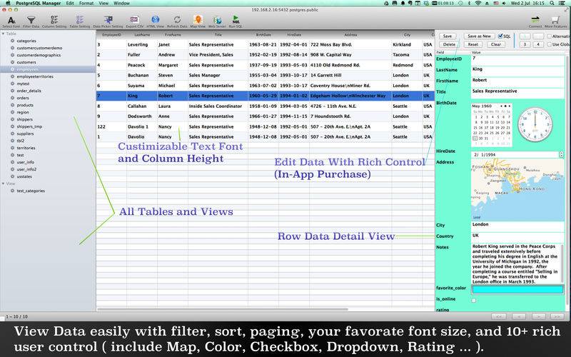 Connect to PostgreSQL server on your Mac with PostgreSQL Manager, you can view data easily with Filter, Sort, Paging. With the In-App Purchase 'Edit Data' you can edit it directly on your Mac.
